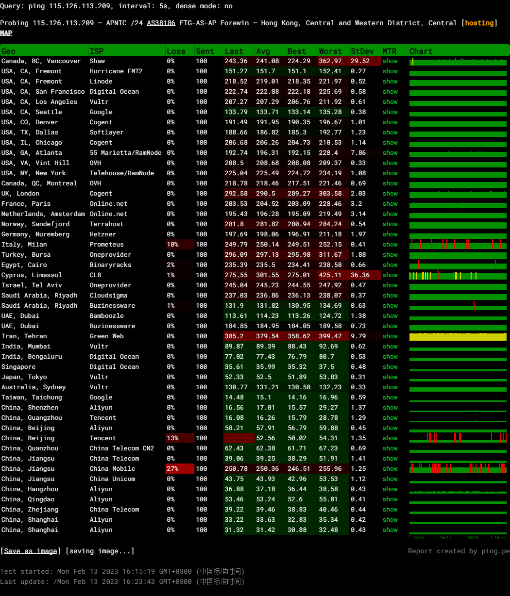 Ping延迟及丢包率测试,全球线路延迟都低,国内延迟最低31ms,稳定无丢包,建站秒开小钢炮。