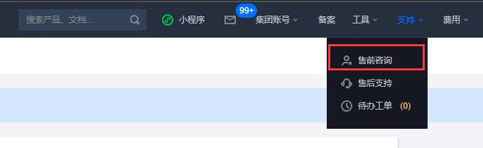 1、通过 https://cloud.tencent.com/,登录后台,找到顶部(右侧)的“服务支持”,下拉单里面的“售前支持”: